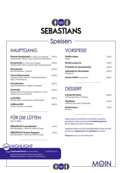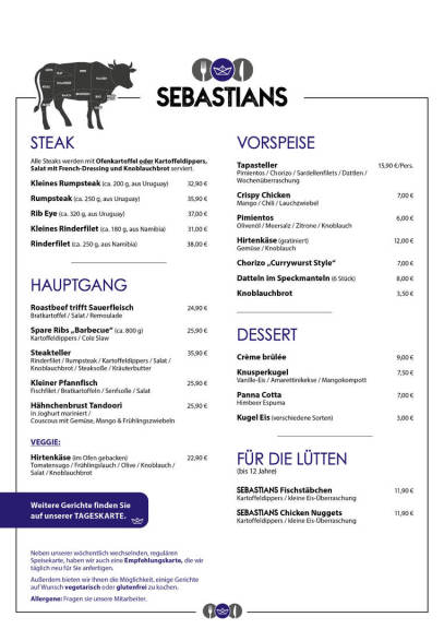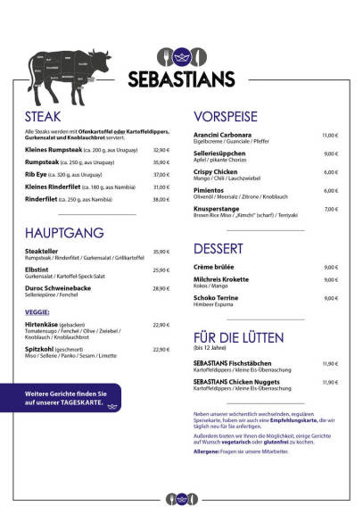 Da wir unseren Gästen Frische und Qualität bieten, gelten die Angaben zur aktuellen Speisekarte so lange der Vorrat reicht. Es kann eventuell zu Änderungen kommen.